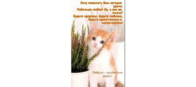 Хочу пожелать Вам сегодня удачи, побольше любви! Ну, а как же иначе? Будьте здоровы, будьте любимы, будьте единственны и неповторимы! Доброе - предоброе утро!