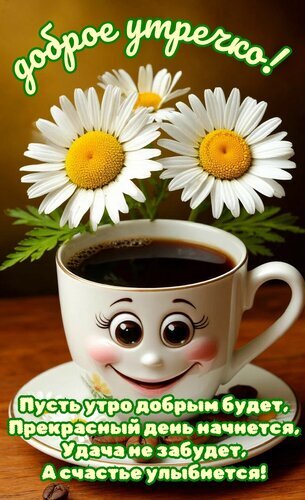 Красивая поздравительная открытка для доброго утра. На изображении изображены три белоснежные ромашки с желтыми сердцевинами и чашка кофе с забавным мультяшным лицом. На фоне уютной деревянной поверхности расположены кофейные зерна. На картинке размещен вдохновляющий текст на русском языке: «Доброе утречко! Пусть утро добрым будет. Прекрасный день начнется, Удача не забудет, А счастье улыбнется!». Идеально подходит для отправки друзьям и близким в мессенджерах (WhatsApp, Viber) для создания позитивного настроения с самого утра.