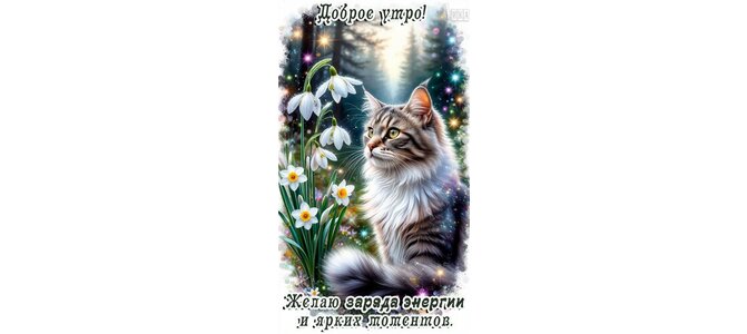 Теги:доброе утро, утро, кошка, лес, весна, пожелания на каждый день, красивая картинка, заряда энергии, ярких моментов, цветы, лесная кошка, пушистик