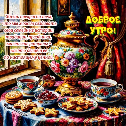 Теги:доброе утро, жизнь прекрасна, традиции, праздник, самовар, пряники, чай, мотивация для жизни, пожелания, открытка, с добрым утром, доброго утра