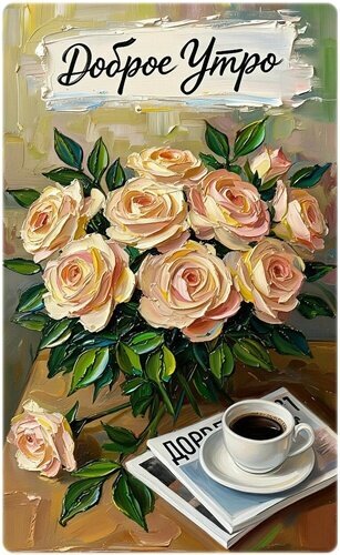 Живописная интерьерная картина в стиле импасто, изображающая пышный букет нежно-розовых и кремовых роз рядом с чашкой ароматного кофе на журнальном столике. В верхней части полотна изящная каллиграфическая надпись «Доброе утро» на светлом мазке. Теплые пастельные тона, богатая текстура мазков и уютная атмосфера делают это изображение идеальным для открыток, пожеланий доброго утра и создания позитивного настроения. Художественный натюрморт с цветами и кофе.