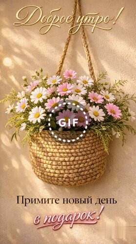 Красивая поздравительная открытка на тему «Доброе утро!». На изображении представлена плетеная корзина с пышным букетом нежных розовых и белых ромашек, залитая мягким солнечным светом. В верхней части картинки каллиграфическая надпись «Доброе утро!», а в нижней — вдохновляющая фраза «Примите новый день в подарок!». Идеально подходит для отправки близким, друзьям и коллегам в мессенджерах (WhatsApp, Viber) или социальных сетях, чтобы пожелать прекрасного начала дня и хорошего настроения. تتميز теплым, уютным и эстетичным стилем.