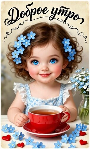Милая и очаровательная открытка с изображением маленькой девочки с голубыми глазами и вьющимися волосами, украшенными цветами незабудками. Девочка в светлом платье сидит за столом и держит чашку горячего чая. На переднем плане — красная чашка на блюдце, россыпь нежных голубых незабудок и маленькие красные сердечки. В верхней части картинки каллиграфическая надпись на русском языке «Доброе утро». Изображение наполнено нежностью, уютом и позитивным настроением, идеально подходит для отправки близким в качестве утреннего пожелания.