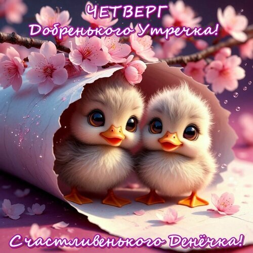 Милая и добрая открытка с двумя пушистыми желтыми цыплятами, выглядывающими из бумажного свитка на фоне нежных розовых цветов сакуры. Изображение наполнено весенним настроением и теплом. Текст на картинке гласит: «Четверг. Добренького утречка! Счастливенъкого Денёчка!», что делает её идеальным пожеланием хорошего дня для друзей и близких в мессенджерах и социальных сетях. Стилистика изображения — мягкая, сказочная 3D-графика, вызывающая улыбку и чувство уюта.