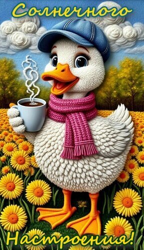 Милая и уютная цифровая иллюстрация с изображением антропоморфного белого утенка в синей кепке и розовом вязаном шарфе. Утенок радостно улыбается, держа в крыле чашку дымящегося горячего кофе на фоне яркого поля желтых подсолнухов и осеннего леса. Надпись на русском языке «Солнечного настроения!» создает позитивную, теплую и вдохновляющую атмосферу. Идеально подходит для открыток, пожеланий доброго утра и создания позитивного настроя.
