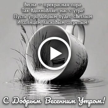 Красивое атмосферное видео для пожелания доброго весеннего утра. На черно белом фоне изображена сюрреалистичная и спокойная сцена: большая чашка, стоящая в воде среди камышей, из которой плавно вытекает поток. Внутри чашки видна маленькая лодка, создающая ощущение уюта и уединения. Видео сопровождено вдохновляющими стихами о красоте весны и теплом солнечном свете. Это идеальный ролик, чтобы отправить близким, друзьям или коллегам и поднять им настроение с самого начала дня. Подарите тепло и нежность этого весеннего утра своим дорогим людям.