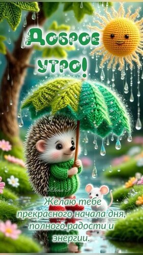Милая и уютная цифровая иллюстрация с ежиком, который прячется под зеленым вязаным зонтиком во время дождя. На картинке изображен маленький ежик в зеленом свитере и белая мышка, стоящие у водоема. На фоне видны солнечный свет, капли дождя и яркие цветы. Надпись на русском языке: «Доброе утро! Желаю тебе прекрасного начала дня, полного радости и энергии». Идеально подходит для отправки в мессенджерах и соцсетях в качестве поздравительной открытки для создания хорошего настроения с самого утра.