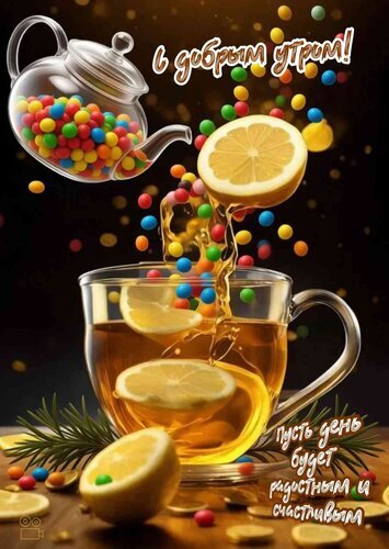 Красивая и яркая поздравительная открытка на доброе утро. На изображении запечатлен процесс наливания ароматного чая с дольками лимона из прозрачного чайника в стеклянную чашку. Композицию дополняют разноцветные конфеты M&M's, рассыпанные по столу и парящие в воздухе, создавая атмосферу праздника и радости. На картинке присутствует надпись на русском языке: " С добрым утром!" и" Пусть день будет радостным и счастливым!". Теплые золотистые тона, веточка розмарина и свежие цитрусовые создают уютное и позитивное настроение. Идеально подходит для отправки друзьям и близким в мессенджерах и социальных сетях для пожелания хорошего начала дня.