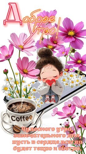 Красивая поздравительная открытка на доброе утро, с нежными розовыми цветами космеи и милой рисованной девочкой. На изображении представлена чашка ароматного кофе и вдохновляющая надпись на русском языке: «Чудесного утра, замечательного дня, пусть в сердце всегда будет тепло и светло». Идеально подходит для отправки в мессенджерах (WhatsApp, Telegram) или социальных сетях, чтобы пожелать близким хорошего настроения и уютного начала дня.