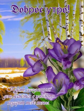 Красивая поздравительная открытка с надписью «Доброе утро!». На изображении крупным планом изображены нежные фиолетовые цветы на фоне живописного весеннего пейзажа с березами и солнечным небом. В нижней части открытки расположена добрая фраза: «Пусть сегодняшний день начнется с улыбки и подарит тебе тепло». Идеально подходит для отправки близким, друзьям и любимым в мессенджерах и социальных сетях для создания позитивного настроения с самого утра.