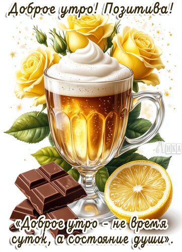 Красивая и вдохновляющая открытка для доброго утра. На изображении представлен аппетитный стакан кофе с пышной белой пенкой, дополненный нежными желтыми розами, кусочками темного шоколада и сочным ломтиком лимона. На картинке присутствует мотивирующая цитата на русском языке: «Доброе утро — не время суток, а состояние души». Идеально подходит для отправки друзьям, близким и коллегам в мессенджерах (WhatsApp, Viber, Telegram) для поднятия настроения и создания позитивного настроя на весь день.