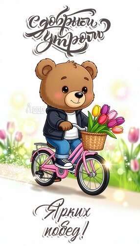 Милая и добрая открытка для хорошего начала дня. На иллюстрации изображен очаровательный мультяшный медвежонок, который едет на розовом велосипеде с корзиной ярких тюльпанов. В верхней части картинки надпись каллиграфическим шрифтом «С добрым утром!», а внизу — пожелание «Ярких побед!». Изображение выполнено в светлых, солнечных тонах с эффектом мерцания, что создает атмосферу радости, уюта и вдохновения. Идеально подходит для отправки в мессенджерах (WhatsApp, Telegram) или социальных сетях в качестве утреннего приветствия для друзей, близких и коллег.