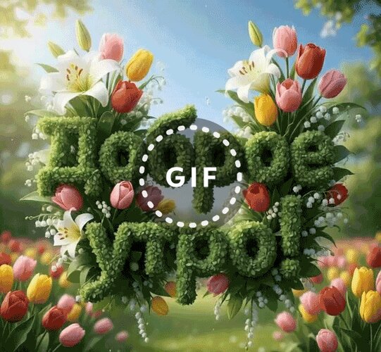 Красивая поздравительная открытка с надписью «Доброе утро!» на русском языке. Текст выполнен в виде объемного зеленого мха или травы. Композиция украшена пышными букетами из разноцветных тюльпанов (розовых, желтых, красных) и белоснежных лилий на фоне солнечного весеннего сада. Изображение наполнено свежестью, яркими цветами и солнечным светом, создавая позитивное и вдохновляющее настроение для утреннего приветствия.
