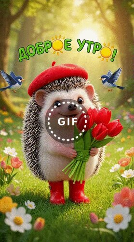 Милая и яркая поздравительная открытка с надписью «Доброе утро!». На картинке изображен очаровательный мультяшный ежик в красном берете и резиновых сапожках, который держит букет красных тюльпанов. Ежик стоит на цветущем лугу под солнечными лучами, а вокруг него летают маленькие птички. Изображение наполнено теплом, уютом и позитивным настроением, идеально подходит для отправки друзьям и близким в качестве утреннего пожелания.