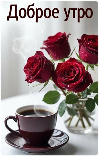 Красивая поздравительная открытка с надписью «Доброе утро». На изображении представлен изысканный букет из четырех насыщенно-красных роз с капельками росы в прозрачной вазе. На переднем плане стоит чашка горячего черного кофе с легким паром, стоящая на блюдце. Композиция выполнена в нежных светлых тонах, создавая атмосферу уюта, романтики и бодрого начала дня. Идеально подходит для отправки в мессенджерах и социальных сетях для пожелания прекрасного утра друзьям, близким или любимым.