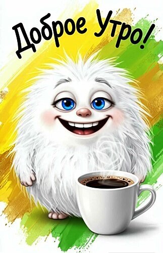Яркая и позитивная поздравительная открытка с надписью «Доброе утро!». На изображении представлен очаровательный, пушистый белый персонаж с большими голубыми глазами и широкой улыбкой, который создает дружелюбное и радостное настроение. Рядом с персонажем стоит чашка горячего черного кофе, от которой исходит легкий пар. Фон выполнен в виде динамичных мазков желтого и зеленого цвета, что символизирует свежесть и энергию нового дня. Идеально подходит для отправки друзьям и близким в мессенджерах для поднятия настроения утром.