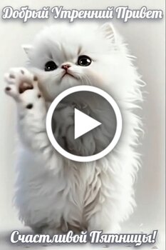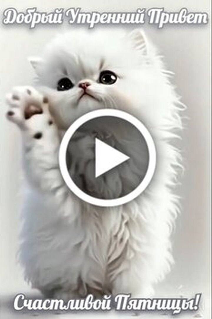 Милое видео с пушистым белым котенком для создания позитивного настроения. На видео запечатлен очаровательный котенок с большими глазами, который приветствует зрителя, поднимая лапку. Текст на видео содержит пожелания доброго утра и счастливой пятницы. Это идеальный ролик, чтобы отправить близким, друзьям или коллегам для поднятия настроения в начале дня и в предвкушении выходных. Поделитесь этой милотой и подарите улыбку своим знакомым.