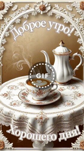 Красивая поздравительная открытка с пожеланием доброго утра. На изображении представлен уютный натюрморт: чашка ароматного кофе с пышной пенкой и латте-артом, стоящая на изящной чашке с цветочным узором, и белый фарфоровый кофейник. Все это расположено на столе с кружевной скатертью. Композиция обрамлена декоративной рамкой с цветами. В верхней части надпись «Доброе утро!», в нижней — «Хорошего дня!». Идеально подходит для отправки в мессенджерах и социальных сетях для создания позитивного настроения.