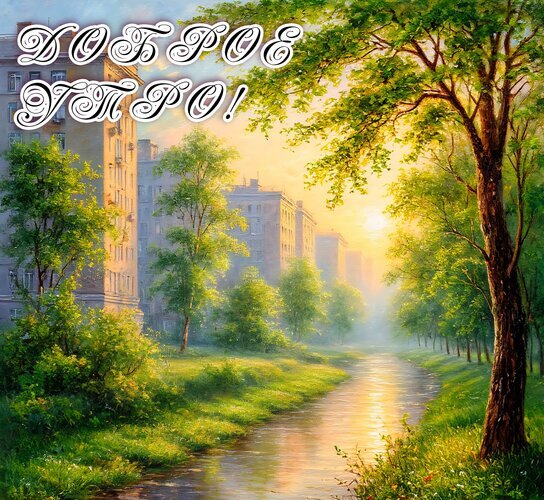 Живописная цифровая иллюстрация, изображающая уютный городской пейзаж в лучах теплого утреннего солнца. На переднем плане — раскидистое дерево с густой зеленой листвой, сквозь которую пробивается мягкий свет. Слева расположено многоэтажное здание, частично скрытое деревьями, а вдоль него тянется извилистая дорожка или небольшой ручей, в котором отражается золотистое сияние заката или рассвета. В верхней части изображения каллиграфической белой надписью на русском языке «Доброе УТРО!» наложена на светлое небо. Атмосфера картины передает спокойствие, свежесть и радость нового дня. Идеально подходит для открыток, поздравлений и вдохновляющих постов.