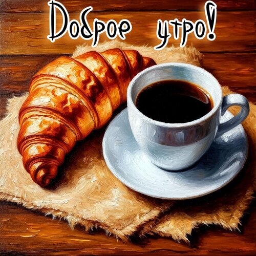 Аппетитная картина в стиле импрессионизма, изображающая идеальный завтрак: свежий золотистый круассан с хрустящей корочкой и чашку горячего черного кофе в белой керамической чашке. Изображение выполнено в теплых тонах на деревянном фоне, создавая уютную и вдохновляющую атмосферу. В верхней части картинки расположена приветственная надпись на русском языке «Доброе утро!». Идеально подходит для поздравительных открыток, постов в социальных сетях и создания утреннего настроения.