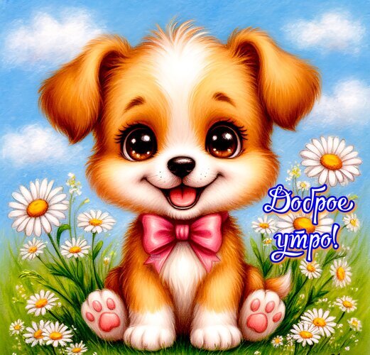 Милая и очаровательная цифровая иллюстрация с изображением рыжего щенка в стиле мультфильмов. Маленький щенок с большими блестящими глазами, белыми лапками и розовым бантом на шее сидит на зеленой лужайке среди цветущих белых ромашек. Яркое голубое небо с легкими облаками создает позитивное и радостное настроение. Идеально подходит для поздравительных открыток, пожеланий доброго утра и создания уютной атмосферы.