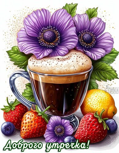 Красочная и аппетитная цифровая иллюстрация, представляющая собой идеальное пожелание доброго утра. В центре композиции — чашка ароматного кофе с пышной кофейной пенкой, украшенная крупными нежными фиолетовыми цветами анемонов. Композицию дополняют сочные красные ягоды клубники, спелый лимон и черника, создавая яркое и свежее настроение. В нижней части изображения расположена стильная надпись на кириллице «Доброго утречка!». Изображение выполнено в насыщенных цветах с детальной прорисовкой, что делает его отличным вариантом для открытки, поздравления в мессенджерах или поста в социальных сетях.