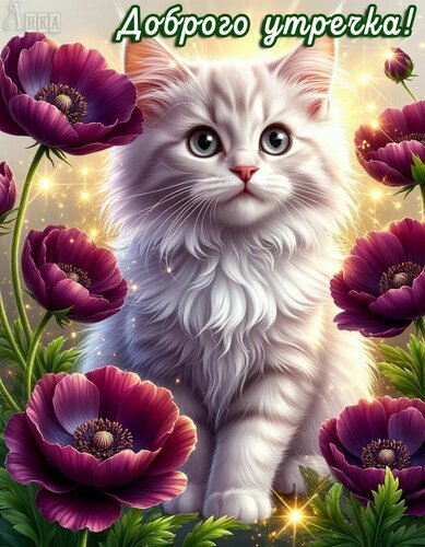 Милое изображение пушистого белого котенка с большими выразительными глазами, окруженного яркими темно-пурпурными цветами анемонами. На картинке присутствует надпись на украинском языке «Доброго утрерка!», что делает её идеальной для отправки в качестве приветственного открытки. Мягкое освещение, золотистые искры и сказочная атмосфера создают ощущение уюта, нежности и позитивного настроения. Подходит для использования в качестве поздравительной картинки для мессенджеров, социальных сетей и открытки на доброе утро.