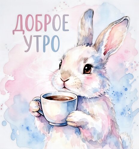 Милая акварельная иллюстрация с изображением белого кролика, который держит чашку горячего кофе или чая. На фоне нежные пастельные разводы розового и голубого цветов. Сверху расположена надпись на русском языке «Доброе утро». Изображение выполнено в мягком, сказочном стиле, идеально подходит для пожеланий доброго утра в социальных сетях, открыток и праздничного контента.