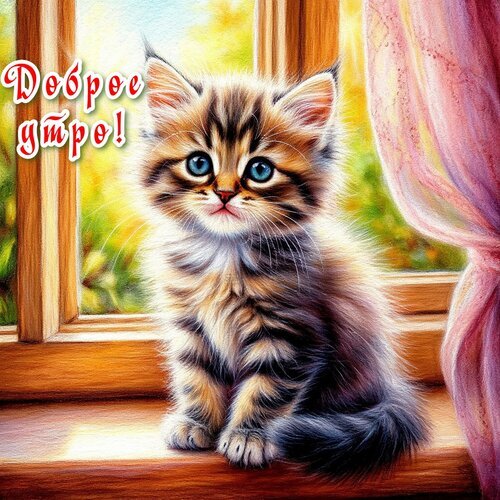 Милая и пушистая иллюстрация с маленьким полосатым котенком, сидящим на деревянном подоконнике у окна. Котенок с большими голубыми глазами смотрит прямо на зрителя. Солнечный свет мягко освещает шерстку животного, создавая теплую и уютную атмосферу. На картинке присутствует надпись на русском языке «Доброе утро!», что делает это изображение идеальным для использования в качестве поздравительной открытки, сторис или заставки для создания позитивного настроения с самого утра. Стиль рисунка напоминает нежную цифровую живопись с высокой детализацией меха.
