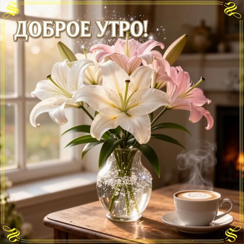 Красивое и вдохновляющее изображение для пожелания доброго утра. На деревянном столе у окна стоит изящная стеклянная ваза с пышным букетом белоснежных и нежно-розовых лилий. Рядом расположена чашка горячего капучино с аппетитной пенкой, от которой поднимается легкий пар. Солнечный свет мягко проникает через окно, создавая уютную и теплую атмосферу раннего утра. Идеально подходит для открыток, соцсетей и создания позитивного настроения.