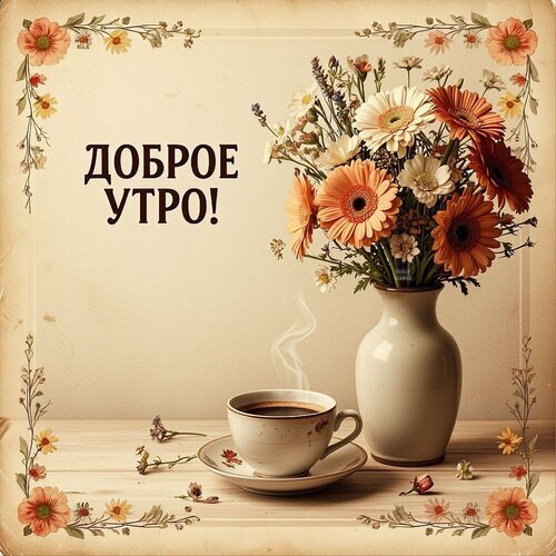 Красивая поздравительная открытка с надписью «Доброе утро!». На изображении представлен изысканный букет разноцветных гербер в белой вазе, стоящий рядом с чашкой дымящегося кофе на блюдце. Композиция дополнена нежной цветочной рамкой по периметру и выполнена в теплых, уютных тонах. Идеально подходит для отправки в мессенджерах и социальных сетях, чтобы пожелать приятного начала дня друзьям и близким.