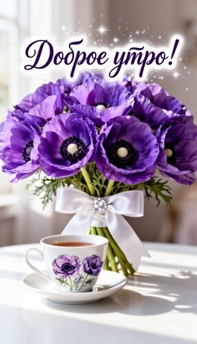 Красивая и вдохновляющая открытка с пожеланием «Доброе утро!». На изображении представлен пышный букет нежных фиолетовых анемонов, перевязанный элегантной белой лентой с блестящей брошью. Рядом стоит изящная чашка чая или кофе, украшенная цветочным принтом в тон букету. Светлая, солнечная композиция создает атмосферу уюта, радости и весеннего настроения. Идеально подходит для отправки близким, друзьям и коллегам в мессенджерах и социальных сетях для создания позитивного начала дня.