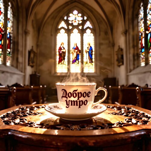 Уютное и атмосферное изображение чашки горячего кофе или чая на деревянном столе в интерьере старинного готического собора. Из чашки поднимается легкий пар, создавая ощущение тепла и спокойствия. На заднем плане видны величественные витражные окна с изображением святых, наполняющие зал мягким светом. На самой чашке нанесена надпись на русском языке «Доброе утро». Композиция идеально подходит для создания настроения утреннего умиротворения, вдохновения и духовного спокойствия.
