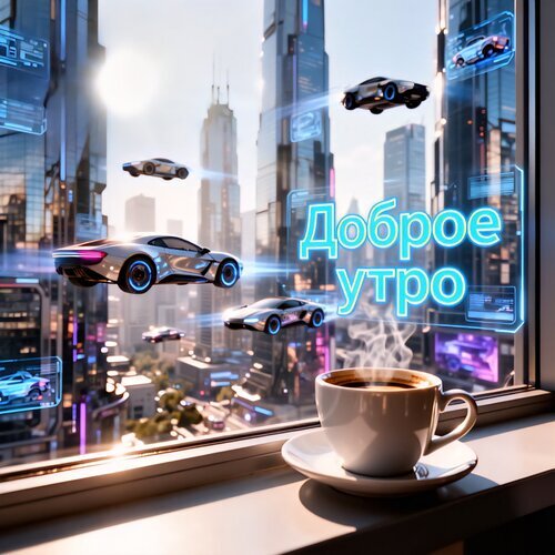 Футуристический городской пейзаж в стиле киберпанк, запечатленный через окно офиса или квартиры. На переднем плане — чашка горячего кофе с аппетитным паром на подоконнике, символизирующая начало рабочего дня. За стеклом открывается вид на мегаполис будущего с высокими небоскребами и летающими автомобилями, перемещающимися между зданиями. На стекле видна неоновая надпись на русском языке «Доброе утро» в сочетании с высокотехнологичными голографическими интерфейсами и цифровыми панелями. Изображение сочетает в себе уют домашнего утра и динамику высокотехнологичного завтрашнего дня.