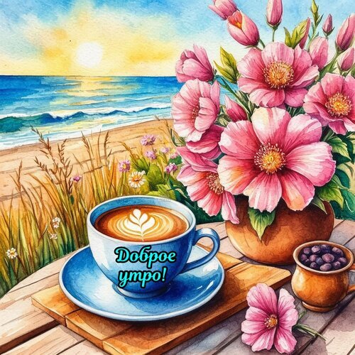 Живописная акварельная иллюстрация, передающая атмосферу уютного и солнечного утра на берегу моря. На переднем плане — чашка ароматного кофе с красивым латте-артом в виде сердечка, стоящая на деревянном столе. Рядом расположен пышный букет нежно-розовых цветов в глиняной вазе и небольшая пиала с ягодами. На заднем плане виден спокойный морской пейзаж с лазурными волнами и мягким светом восходящего солнца. Картинка наполнена теплом, умиротворением и вдохновением, идеально подходит для пожелания доброго утра.