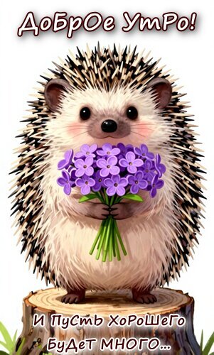 Милая и добрая открытка с изображением пушистого ежика, который держит в лапках букет нежных фиолетовых цветов. На картинке красуется надпись на русском языке: «Доброе утро! И пусть хорошего будет много...». Изображение выполнено в светлых, позитивных тонах, идеально подходит для отправки друзьям, близким и любимым в мессенджерах (WhatsApp, Viber) или социальных сетях, чтобы пожелать прекрасного начала дня и отличного настроения. Тяжелая детализация меха ежика и яркие цветы создают уютную и теплую атмосферу.