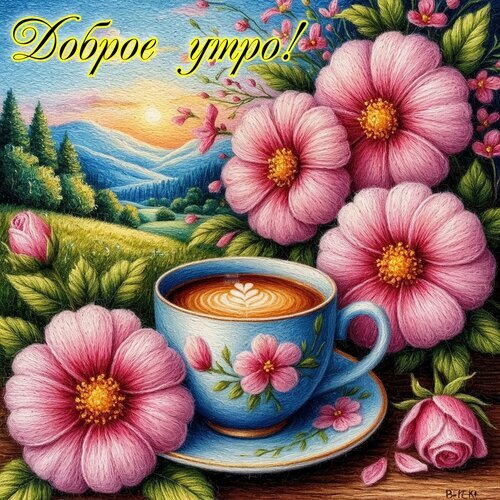 Живописная и уютная иллюстрация, изображающая чашку ароматного кофе с латте-артом в виде сердца, окруженную пышными розовыми цветами. На заднем плане открывается прекрасный вид на солнечный рассвет в горах и цветущие луга. Картина выполнена в мягком, теплом стиле, напоминающем пастель или акварель, и идеально передает атмосферу доброго и вдохновляющего утра. Подойдет для использования в качестве открытки, обоев на рабочий стол или декоративного изображения для пожелания хорошего дня.
