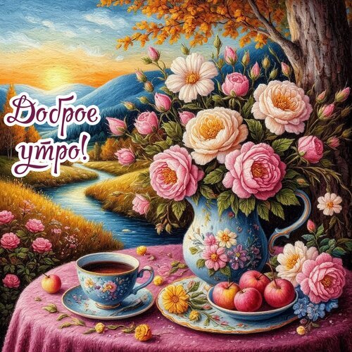 Живописное изображение в стиле импрессионизма, изображающее натюрморт на фоне утреннего пейзажа. На переднем плане на столе под розовой скатертью стоит изящная голубая ваза с пышным букетом розовых и белых роз. Рядом расположена чашка ароматного кофе или чая на блюдце и тарелка со свежими красными яблоками. Задний план представляет собой безмятежный пейзаж с извилистой рекой, горами и золотистым светом восходящего солнца сквозь листву деревьев. Надпись на русском языке «Доброе утро!» добавляет изображению теплоты и уюта. Идеально подходит для поздравительных открыток, эстетичных постов в соцсетях и пожеланий доброго утра.