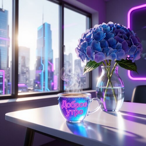 Эстетичное и вдохновляющее изображение для начала дня: чашка горячего кофе с надписью «Доброе утро» на светлом столе. Рядом стоит ваза с пышными голубыми гортензиями. На заднем плане — панорамное окно с видом на футуристичный мегаполис в лучах восходящего солнца и неоновом свечении. Атмосфера спокойного, стильного и технологичного утра в большом городе. Идеально подходит для стоков, соцсетей и утренних пожеланий.