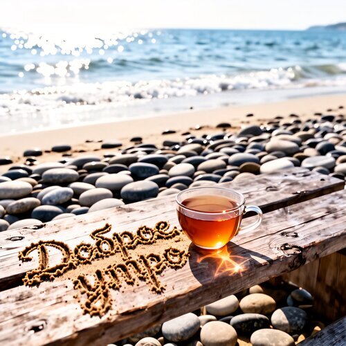Уютное и вдохновляющее изображение солнечного утра на морском побережье. На переднем плане на деревянном помосте стоит чашка горячего чая, залитая мягким солнечным светом. Рядом с чашкой на дереве аккуратно выложено из песка приветствие «Доброе утро». Фон представляет собой живописный пляж с галькой и лазурным морем, где солнечные блики танцуют на волнах. Идеально подходит для создания атмосферы спокойствия, позитива и утреннего релакса.