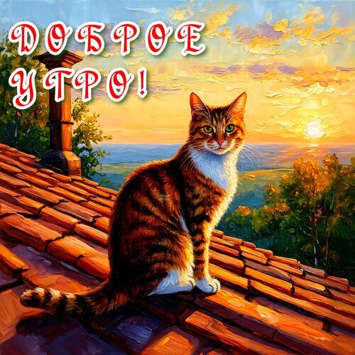 Живописная цифровая картина, изображающая рыжего полосатого кота, сидящего на черепичной крыше на фоне великолепного заката. Солнечные лучи подсвечивают шерсть кошки и создают теплую, уютную атмосферу. На изображении крупная надпись на русском языке «ДОБРОЕ УТРО!», выполненная в декоративном стиле с белым контуром. Пейзаж включает в себя мягкие облака, золотистое небо и силуэты деревьев, что делает картинку идеальной для поздравительных открыток и пожеланий хорошего начала дня.