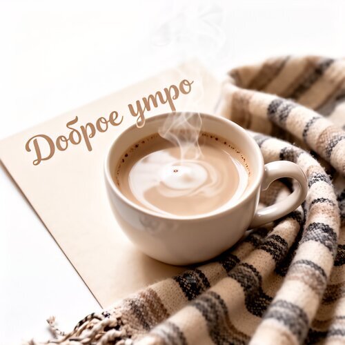 Уютная и эстетичная композиция для пожелания доброго утра. На светлом фоне изображена чашка горячего капучино или кофе с молоком, от которой идет легкий пар. Чашка стоит на светлой открытке с надписью «Доброе утро» на русском языке. Рядом лежит мягкий вязаный плед в полоску бежевых и коричневых тонов, создающий атмосферу тепла, комфорта и спокойного начала дня. Идеальное изображение для социальных сетей, сторис и утренних открыток.