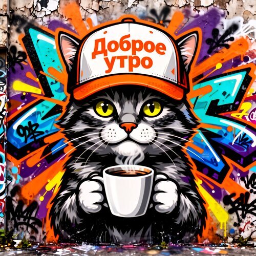 Яркая и стильная иллюстрация в стиле граффити, изображающая милого серого котика с большими желтыми глазами, который держит чашку горячего кофе. На голове у кота — кепка с надписью «Доброе утро» на русском языке. Фон выполнен в технике уличного искусства с динамичными всплесками оранжевого, синего и фиолетового цветов. Идеально подходит для создания позитивного настроения, использования в качестве заставки, открытки или мотивационного постера для любителей кофе и уличного искусства.