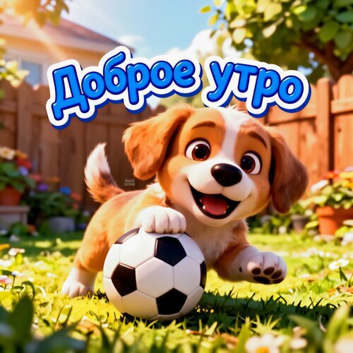 Милая 3D-иллюстрация с мультяшным щенком, играющим с футбольным мячом на зеленой солнечной лужайке. На картинке крупная надпись на русском языке «Доброе утро». Яркая, позитивная и радостная картинка, идеально подходящая для отправки в мессенджерах (WhatsApp, Telegram) в качестве утреннего пожелания хорошего настроения. Высокое качество, сочные цвета, летняя атмосфера.