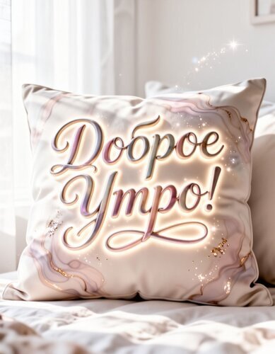 Декоративная интерьерная подушка с надписью «Доброе утро!» в элегантном каллиграфическом стиле. Подушка выполнена в нежных пастельных тонах с изысканным мраморным принтом и золотистыми прожилками. Надпись имитирует мягкое неоновое свечение, создавая уютную и вдохновляющую атмосферу в спальне или гостиной. Идеальный подарок для создания позитивного настроения каждое утро. Стильный аксессуар для современного интерьера в стиле минимализм, лофт или скандинавский стиль.