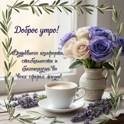 Красивая поздравительная открытка с пожеланием доброго утра. На изображении представлен уютный натюрморт: букет нежных белых и фиолетовых роз в керамической вазе, чашка горячего кофе на блюдце и веточки лаванды. Композиция обрамлена декоративной оливковой ветвью. Текст на русском языке гласит: «Доброе утро! Душевного комфорта, стабильности и благополучия во всех сферах жизни!» Идеально подходит для отправки в мессенджерах и социальных сетях для создания позитивного настроения.