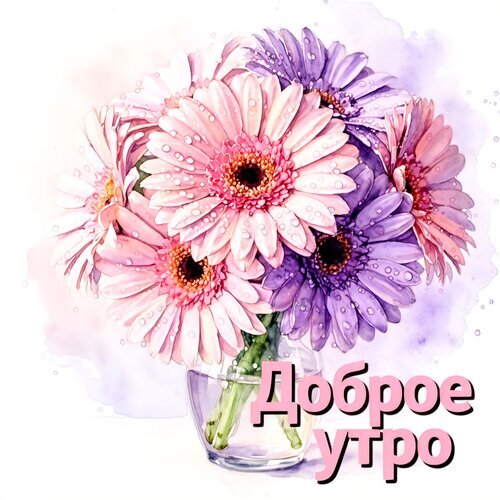 Живописный акварельный букет из розовых и фиолетовых гербер в прозрачной стеклянной вазе с каплями росы на лепестках. Нежная цветочная композиция на светлом фоне с надписью «Доброе утро» на русском языке. Идеально подходит для поздравительных открыток, пожеланий доброго утра и создания романтического настроения. Иллюстрация выполнена в мягких пастельных тонах, передающих свежесть и весеннее настроение.