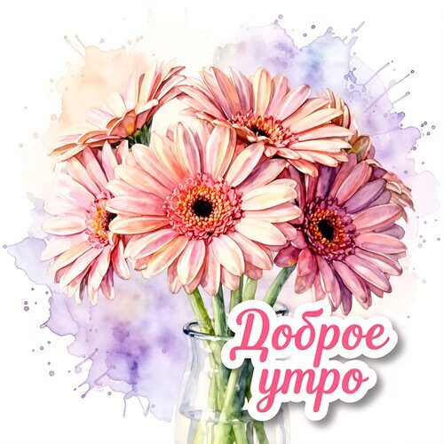 Красивая акварельная иллюстрация с букетом нежных розовых гербер в стеклянной вазе. Изображение выполнено в мягких пастельных тонах с эффектом акварельных брызг на светлом фоне. В правом нижнем углу расположена стильная надпись на русском языке «Доброе утро», выполненная розовым шрифтом с белой обводкой. Идеально подходит для использования в качестве поздравительной открытки, декора для социальных сетей, сторис или в качестве вдохновляющей картинки для пожелания доброго утра друзьям и близким.