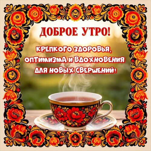 Красочное поздравительное изображение с пожеланиями доброго утра. Композиция оформлена в традиционном русском стиле Хохлома с ярким орнаментом из красных и золотых цветов на черном фоне. В центре кадра — чашка горячего чая с поднимающимся паром, стоящая на блюдце. На фоне солнечного пейзажа расположен текст на русском языке: «Доброе утро! Крепкого здоровья, оптимизма и вдохновения для новых свершений!». Идеально подходит для рассылки открыток, соцсетей и мессенджеров для создания позитивного настроения с утра.