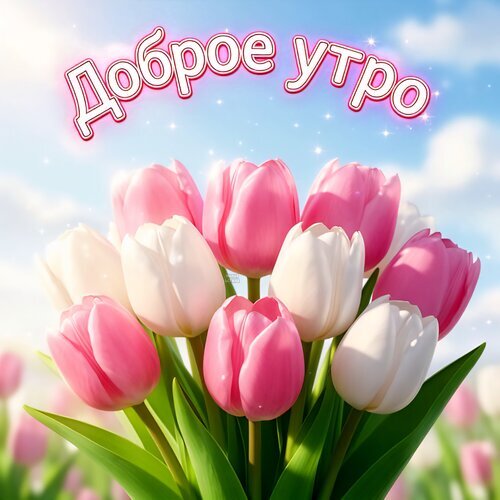Красивая открытка с надписью «Доброе утро» на фоне нежного голубого неба. В центре композиции — пышный букет из розовых и белых тюльпанов. Цветы выглядят свежими и яркими, создавая весеннее и радостное настроение. Идеальное изображение для пожелания доброго утра друзьям, близким и любимым в социальных сетях или мессенджерах.